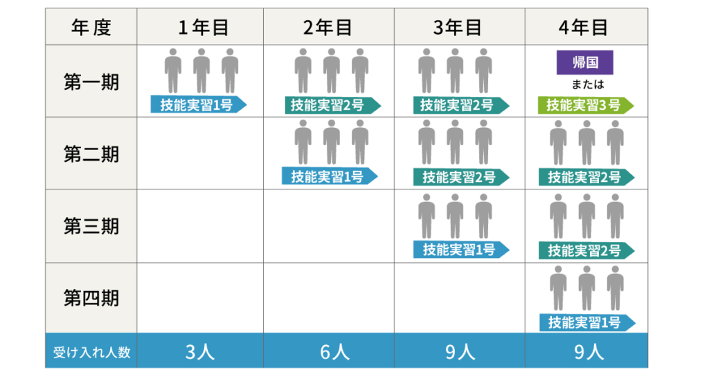 3年目以降には、9名の技能実習生在籍することになります。但し「優良実習実施者」の受入企業様は、その限りではありません。